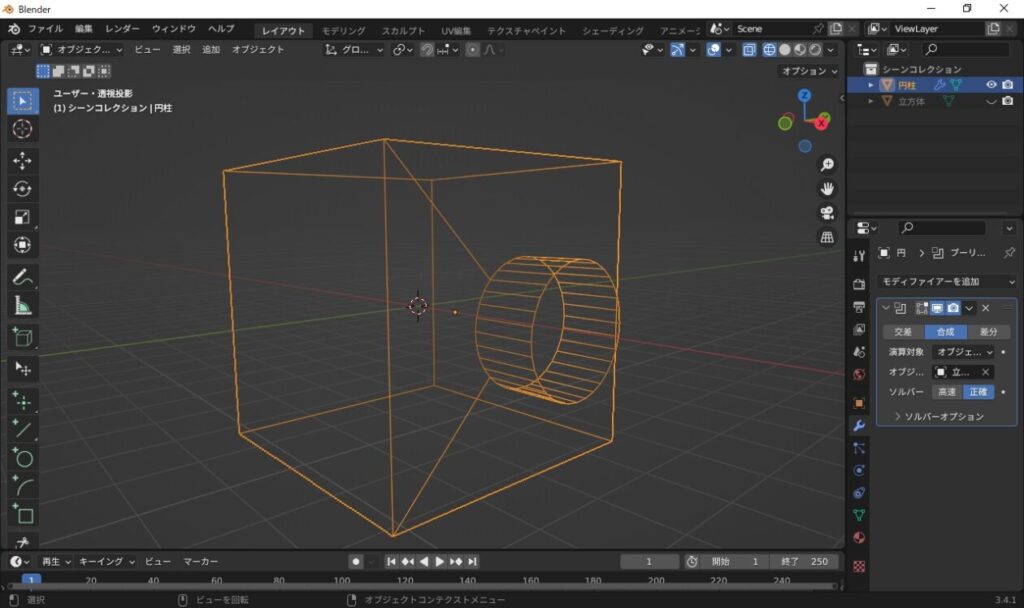 もしこれで片方のオブジェクトが消えてしまうようなら自分自身と交差にチェックを入れる