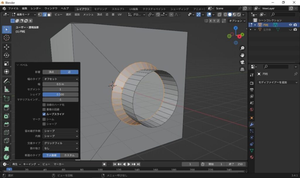 そうすることで四角と円柱の際の部分をベベルしたりできるようになります!