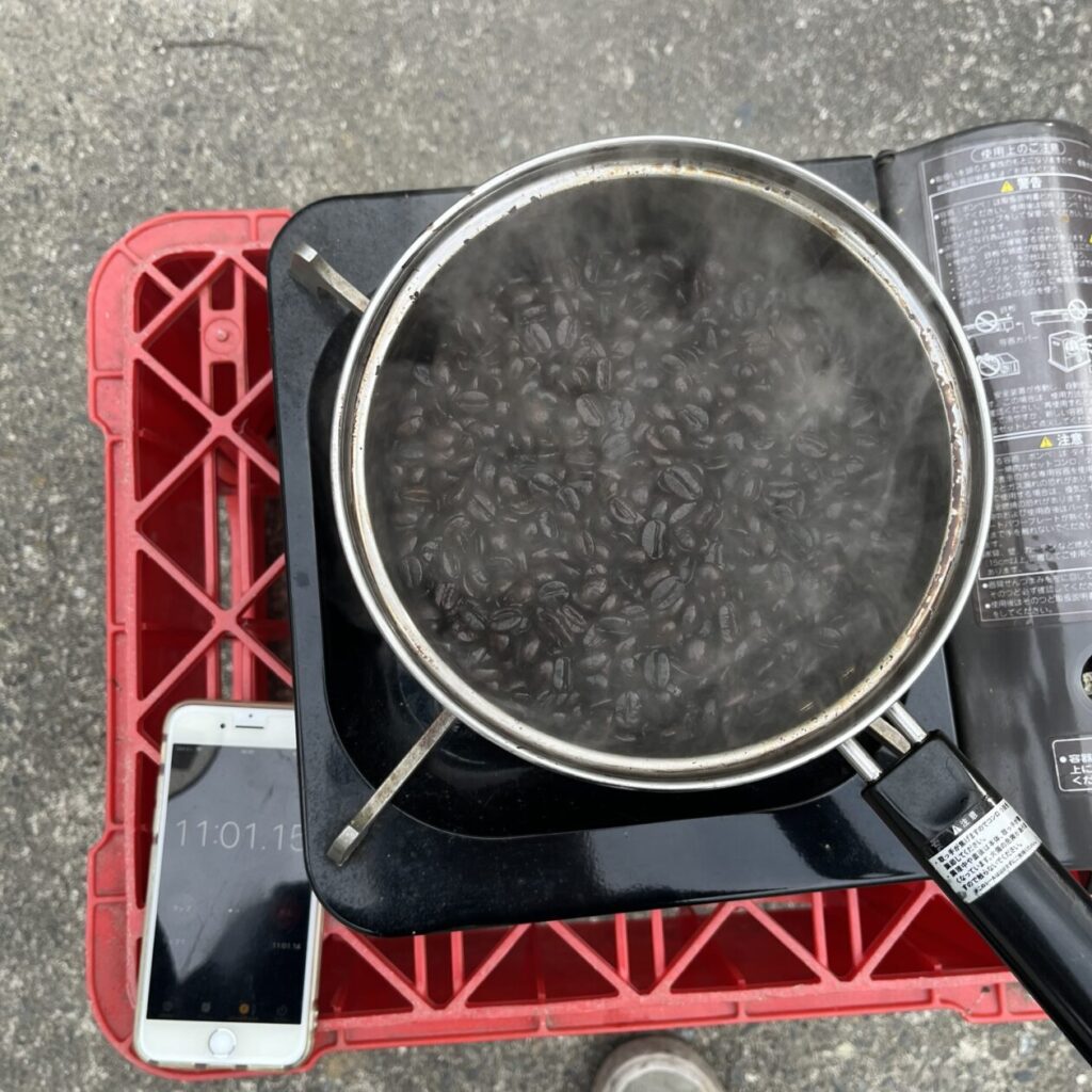 ここから焙煎をしていくのですが、この日は風がびゅーびゅーに吹いている極寒の中で屋外でフライパンを振ることに