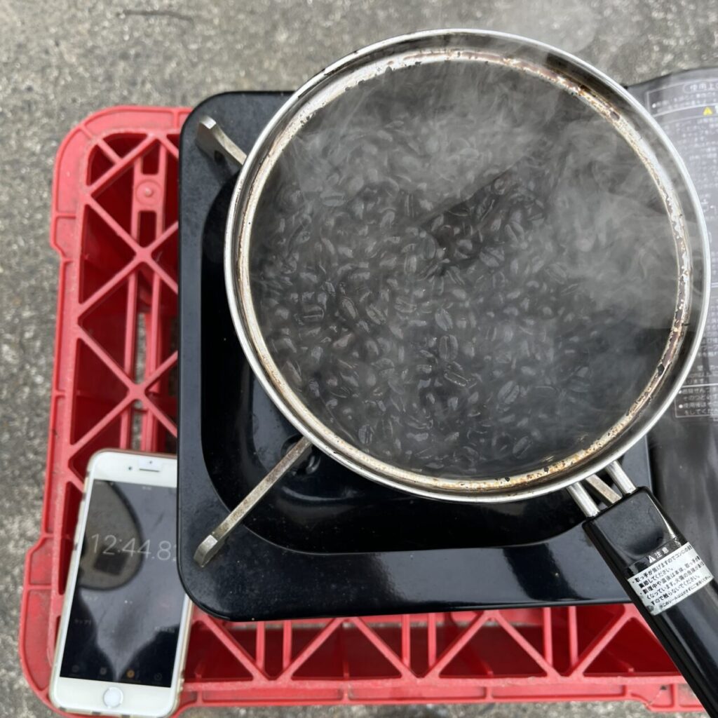 もうすでにものすごい勢いで焙煎が進んでいるのでフタを取っ払って鍋を振り続けます。
